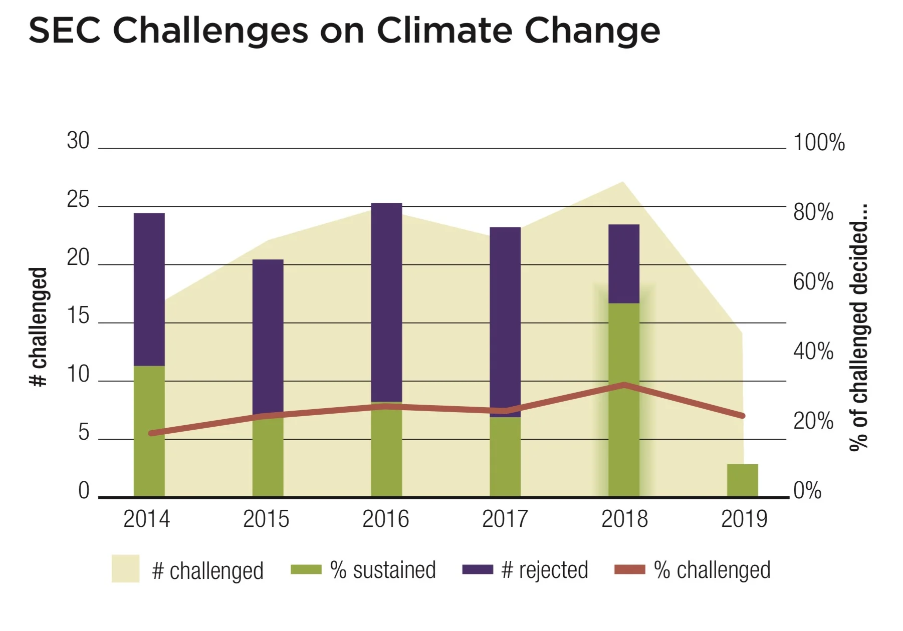 The ultimate impact of the SEC’s new clarifications of the Shareholder Proposal Rule in 2017 and 2018 remains to be seen. Overall, the new approaches did not substantially affect the outcome of challenges in 2018 (left graph); this was not true for climate-related proposals, however, which were disproportionately affected (right graph).