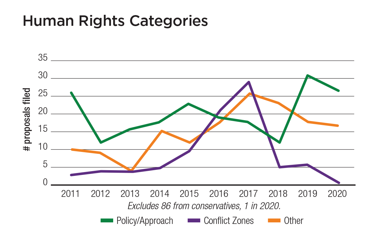 Just eight of the 40 proposals filed on human rights in 2020 are resubmissions. Most resolutions (30) are now pending, eight have been withdrawn and two have been omitted. The SEC has yet to respond to nine no-action challenges.