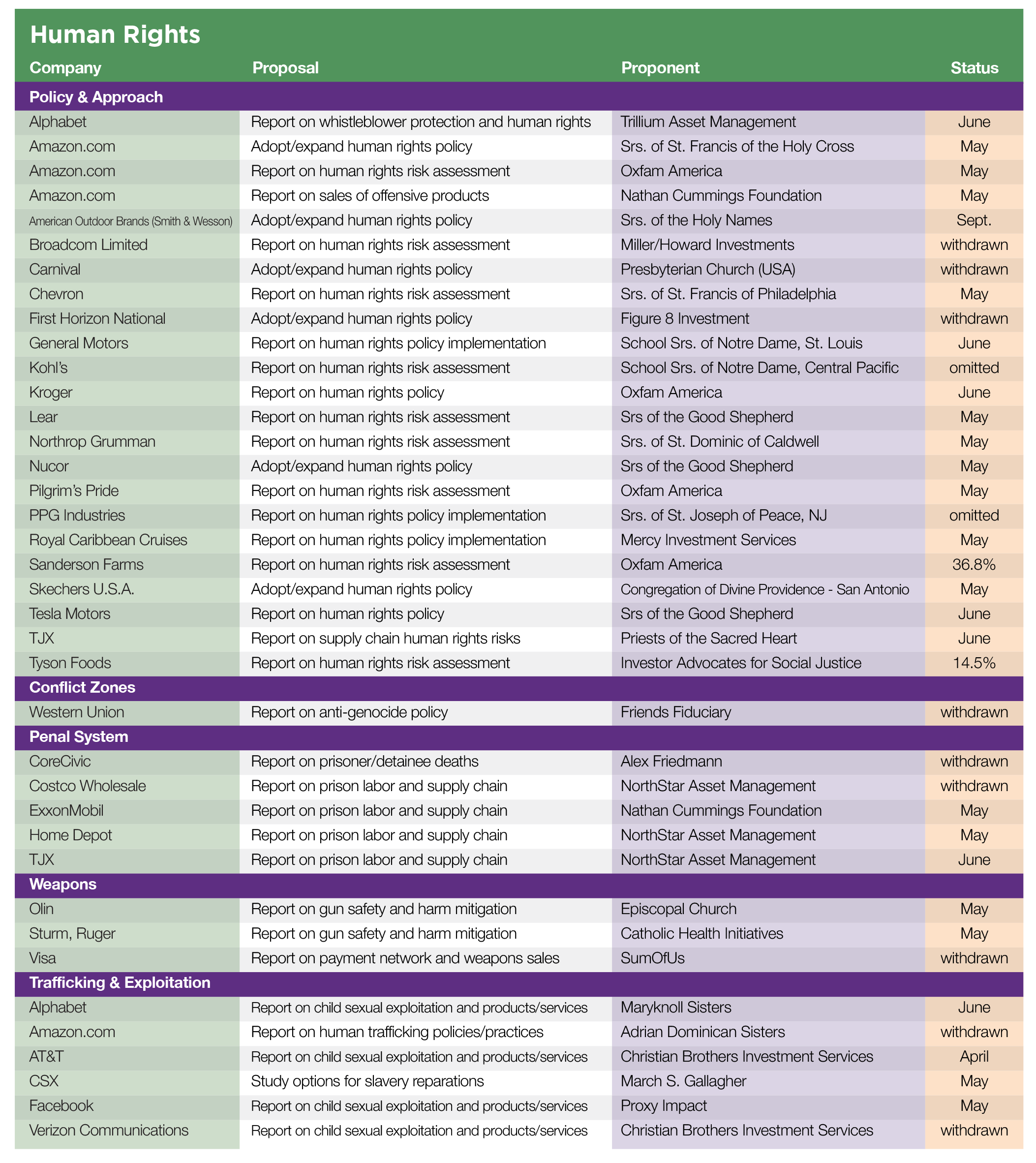 Child sexual exploitation: Christian Brothers Investment Services, Proxy Impact, and several faith-based ICCR members launched a new effort last year to enlist corporate support for ending child sexual exploitation online. Just one of three proposals went to a vote in 2019, earning 33.9 percent at Verizon Communications. Also last year, CBIS ended up withdrawing at Apple after discussions with the company about its policies. This year, there are four proposals: